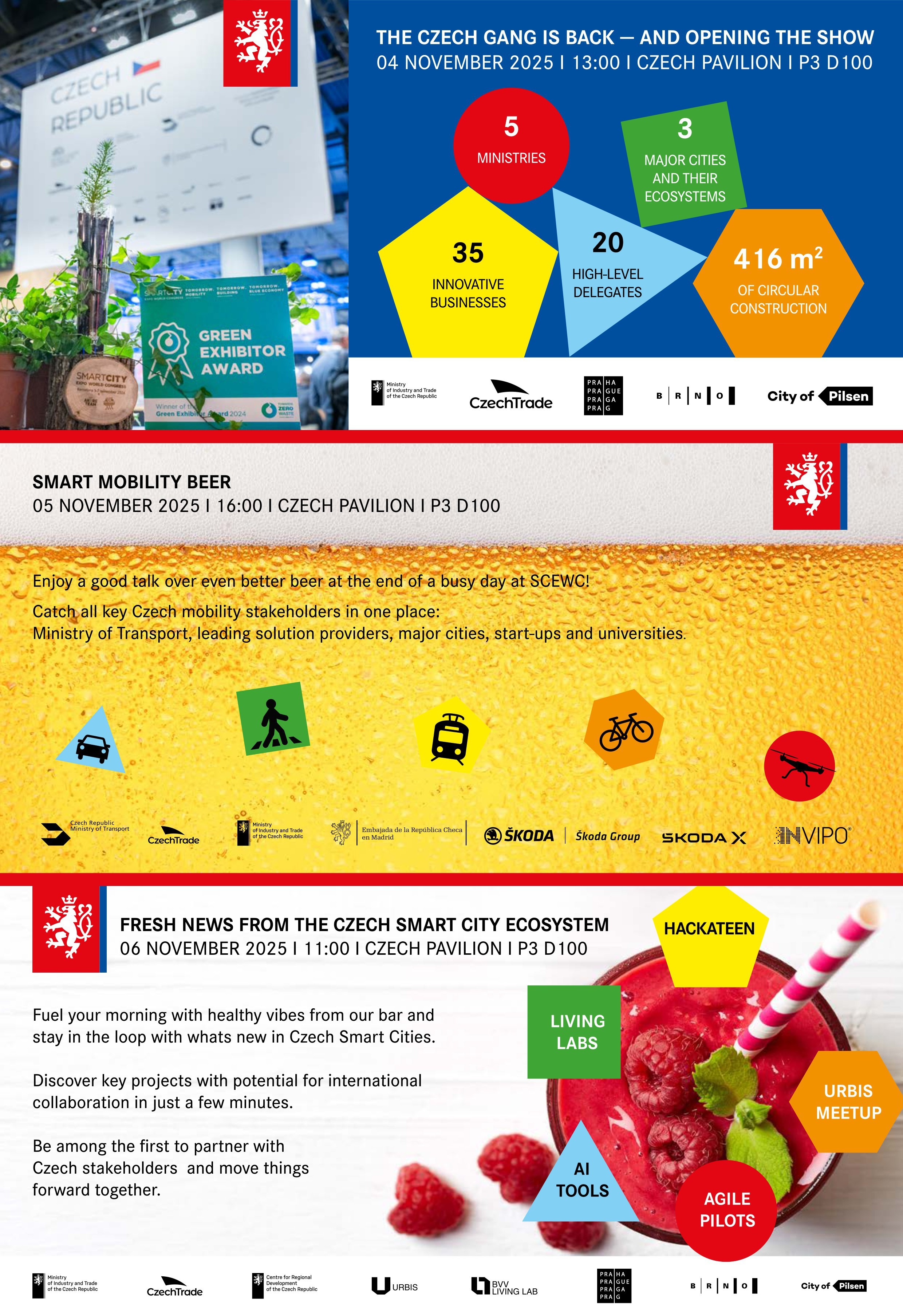 ABOUT THE EVENTCzechs and BAR(celona) – it’s a connection that has already resonated across the international Smart Cities community. Few topics rely so much on mutual understanding and wide-ranging cooperation as urban innovation and regional development. That’s why the Czech Republic not only brings top-tier innovations but also creates a relaxed, welcoming space where participants can form meaningful partnerships, tackle key urban and municipal challenges together as partners, and enjoy themselves like good friends – perhaps over a beer or a signature cocktail. In 2025, the Barcelona Smart City Expo World Congress enters its 14th edition. The number one global event in smart cities showcases the latest innovations and forward-thinking solutions that address the most pressing challenges of today's urbanisation, bringing together experts and major players from across the globe in one place at one time. The Czech Republic will be right there once again – especially after a record-breaking participation in 2024, which also resulted in winning awards for the most sustainable exhibition and the most promising startup.